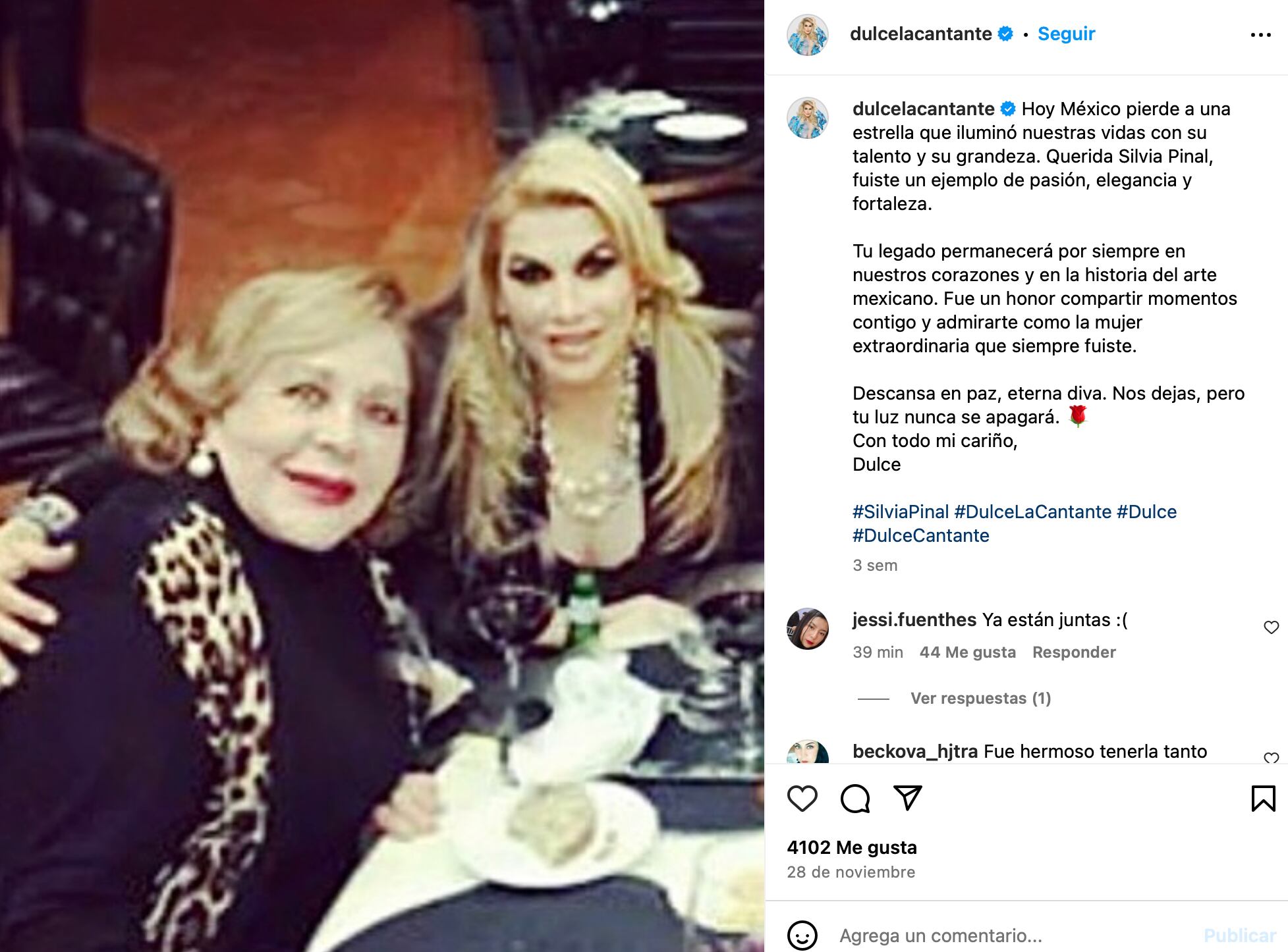 Asimismo, la publicación no solo reflejaba su admiración por la diva del cine de oro mexicano, sino también la profunda conexión que ambas artistas compartieron a lo largo de sus carreras; por lo que también destacó que el legado de Silvia Pinal perduraría por siempre en los corazones de los mexicanos y en la historia del arte nacional, agradeciendo el honor de haber compartido momentos con ella.